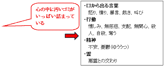 イエス様を受け入れても心の中に汚いゴミ(悪い物)が入っている状態であると、人に対する言葉や行動が変わります。何故なら心に満ちている事(悪い物)を話し、人を傷つけ、憎み、殺してしまいます。図に示す絵の状態です。